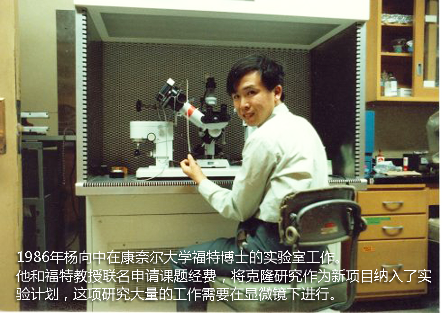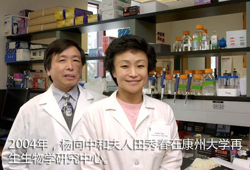 1996年楊向中加入美國康涅狄格大學,任該校動物科學系副教授和生物技術中心動物基因部主任,負責組建該校轉基因動物實驗室;2001年創立康涅狄格大學再生生物學中心,并擔任主任。