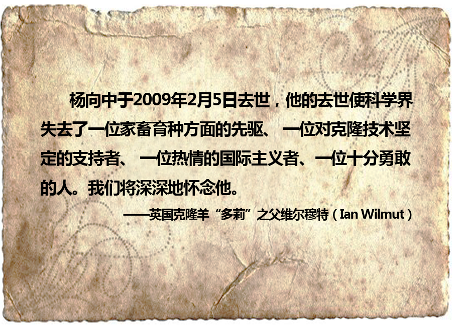 楊向中曾說這段經歷為他今后走入科學殿堂作了鋪墊。他酷愛動物培育技術研究,“赤腳獸醫”的經歷進一步增加了他對這門學科的熱愛,沒有這些經歷就沒有他后來的克隆研究成就。